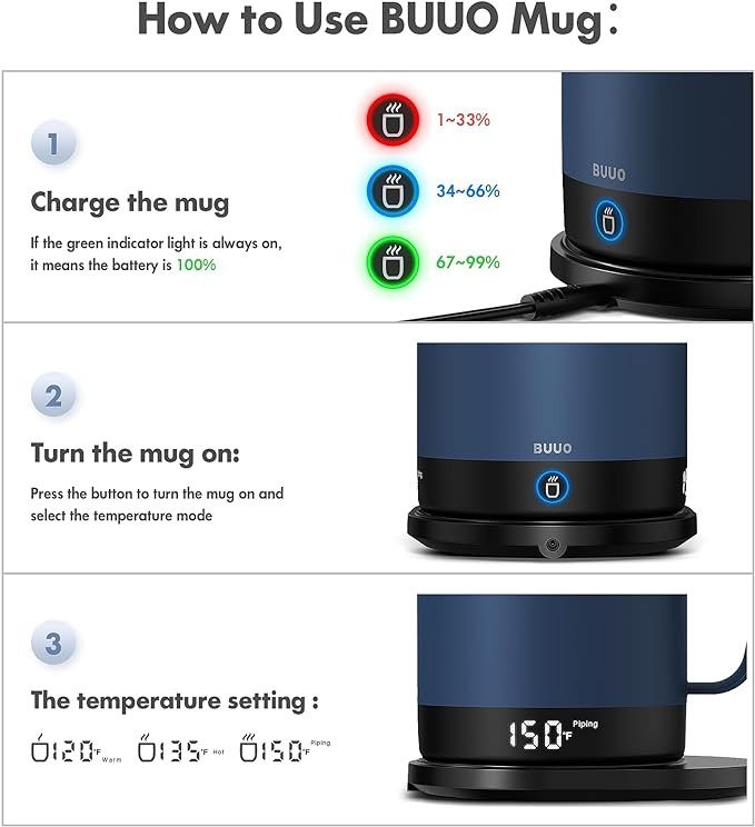 • It’s 3 p.m. and Your Morning Coffee Is Piping Hot: You take the time to make the perfect coffee at the perfect temperature, only to discover it’s gone cold before you drink it. Before you go reheating it or making another cup, consider getting a BUUO coffee mug that keeps coffee hot for you. BUUO self-heating mug's convection current at the molecular level circulates liquid from top to bottom, perfectly maintains the preferred temperature for hours. Now wave bye-bye to cold cups of coffee.