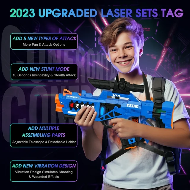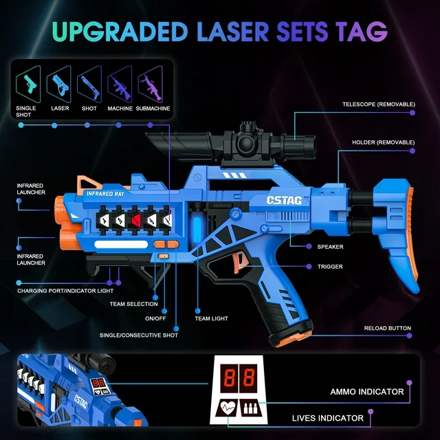 • ARCADE STYLE LAZER TAG GAME:Turn your home or backyard into a laser tag arena with the laser tag blaster set,this fully interactive set designed with infrared receivers and light emitters that are fun and reduce the chance of injury.