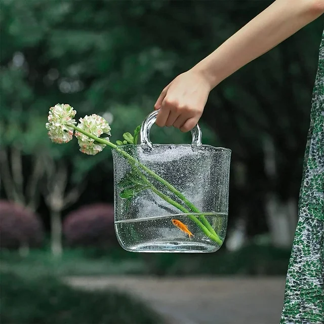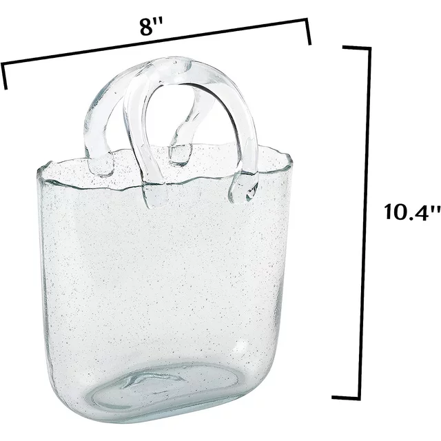 • ❥ UNIQUE DESIGN - Clear hand blown glass vase in purse shape, 10.23 ″ x 7.87 ″ x 4.33 ″, polished flat bottom for stable standing.Two handles firmly fixed to the bottle body. Small bubbles are evenly dispersed in the vase, which is a feature of the art of hand-blown glass vase. All works are hand-made by skilled craftsmen, and with their hand-made structure, no two pieces are identical.