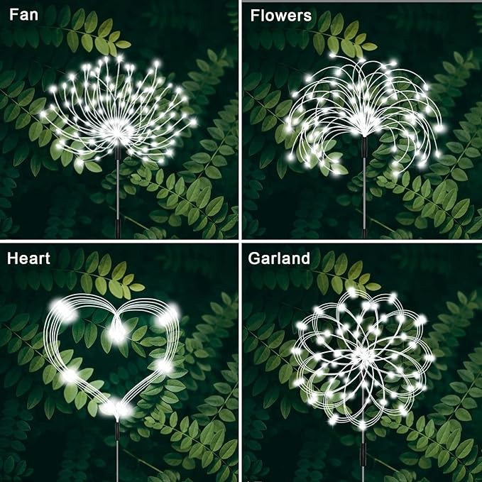 ✬ 8 Lighting Model-- Decorative firework light can be adjusted in 3 brightness and 8 modes, you can use the remote control to choose your favorite light mode. There is an automatic light sensing function in the garden light, which automatically charges in the sun during the day and automatically lights up and flashes at night.